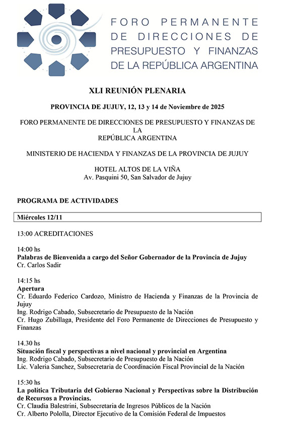 Los días 12, 13 y 14 de noviembre en la Ciudad de San Salvador de Jujuy, se llevará a cabo una nueva Reunión Plenaria del Foro Permanente de Direcciones de Presupuesto y Finanzas de la República Argentina.